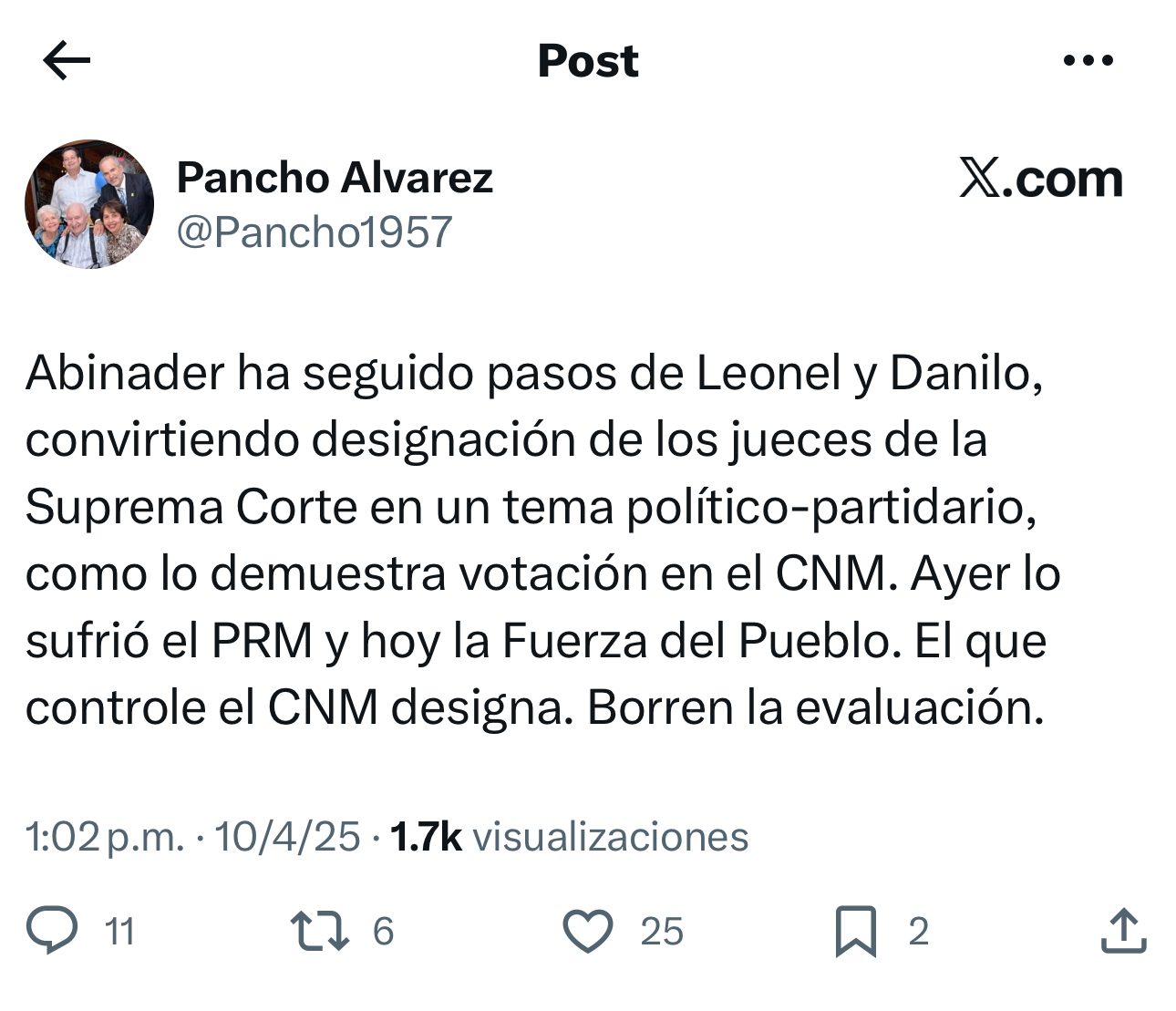 “Abinader ha seguido los pasos de Leonel y Danilo, convirtiendo la designación de los jueces de la Suprema Corte en un tema político-partidario, como lo demuestra la votación en el CNM. Ayer lo sufrió el PRM y hoy la Fuerza del Pueblo. El que controle el CNM, designa. Borren la evaluación”, afirmó el jurista.