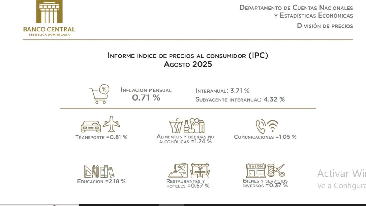 El reporte del BCRD indica que el IPC de los beneficios transables experimentó una variación de 0.63 % en agosto de 2025, generada principalmente por las alzas de precios en los automóviles, cerveza envasada y algunos beneficios alimenticios. En relación con la variación mensual del índice de los beneficios y servicios no transables, la misma se situó en 0.79 %.