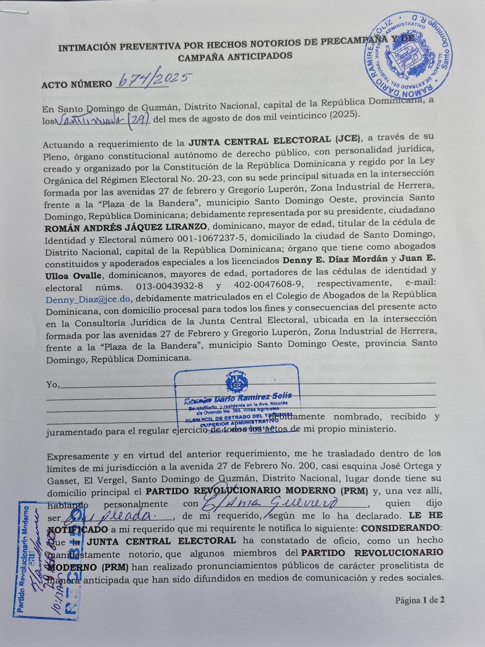 El Pregonero, Santo Domingo. La Acoplamiento Central Electoral (JCE) notificó formalmente al Partido Revolucionario Flamante (PRM) por la realización de actos que constituyen precampaña y campaña electoral anticipadasegún consta en la intimación preventiva levantada mediante acto de alguacil núm. 674/2025.