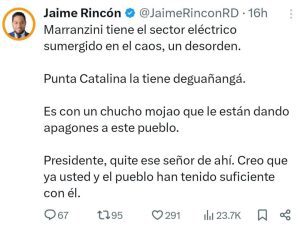 A través de su cuenta de X, Rincón denunció que “Punta Catalina la tiene deguañangá” y criticó que los apagones son constantes y abusivos, al punto de describirlos como “con un chucho mojao que le están dando apagones a este pueblo”.