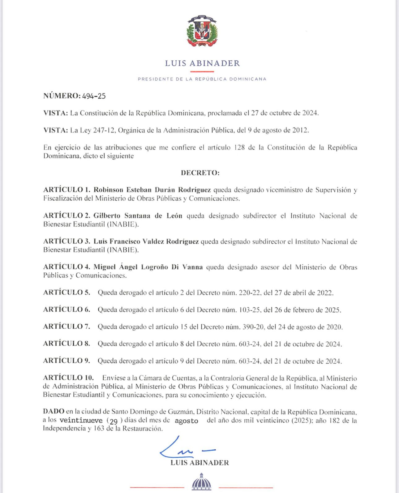 El Pregonero, Santo Domingo. – El presidente de la República, Luis Abinader, emitió el decreto núm. 494-25, mediante el cual se producen importantes designaciones y derogaciones en distintas dependencias del Estado, particularmente en el Tarea de Obras Públicas y Comunicaciones y en el Instituto Franquista de Bienestar Estudiantil (INABIE).