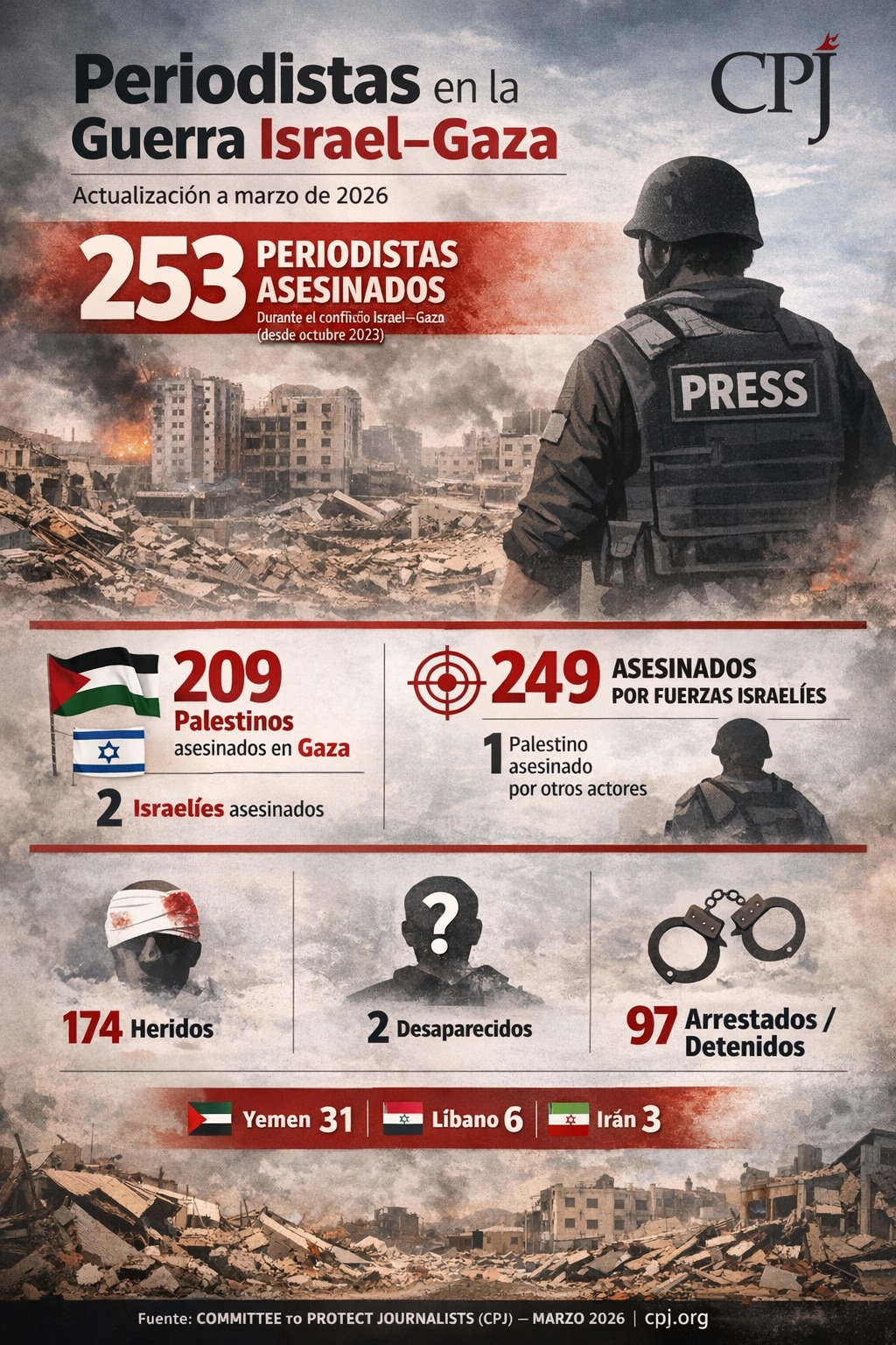 Santo Domingo.- No es una estadística. Es una señal de quiebre en vivo. Desde octubre de 2023, 253 periodistas han sido asesinados en el conflicto Israel–Lazo. De ellos, 209 eran palestinos en Lazo. 249 muertes han sido atribuidas a acciones militares israelíes. A esto se suman 174 heridos, 97 detenidos y 2 desaparecidos.